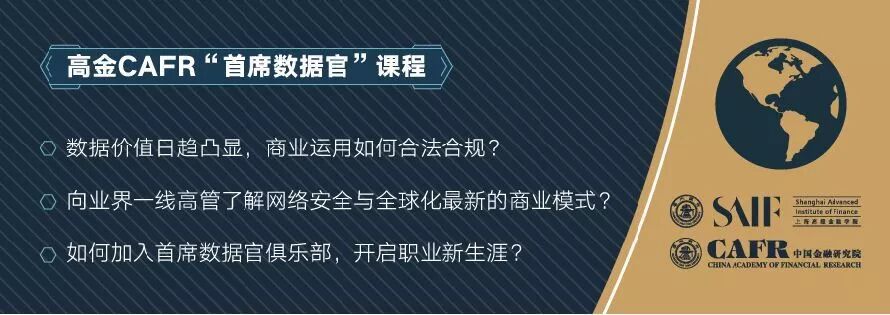 18:00-18:30 嘉宾签到 18:30-18:35 领导致辞 倪海英 上海交通大学中国金融研究院助理院长、上海高金金融研究院助理院长 18:35-19:20 主旨演讲1:数字科技应尊重和保护客户数据权利 郭俊秀 中国东方航空集团有限公司总法律顾问、法律合规部部长 19:20-20:05 主旨演讲2:新形势下金融数据运用的合规和风控 许多奇 上海高级金融学院兼聘教授,复旦大学法学院教授,博士生导师 20:05-20:50 主旨演讲3:数据中台的重要性与现实运用 杨培骏 联合见智科技有限公司总经理 20:50-21:20 圆桌讨论:数据商用的合规边界与前景展望 主持人:容宇,上海爱钛技术创始人 郭俊秀,中国东方航空集团有限公司总法律顾问、法律合规部部长 许多奇,上海高级金融学院兼聘教授,复旦大学法学院教授,博士生导师 杨培骏,联合见智科技有限公司总经理 黄贤峰,上海金仕达软件科技有限公司副总裁 赵一铂,招商银行总行零售金融总部风险管理团队负责人 21:20-21:30 首席数据官课程发布&首席数据官俱乐部启动仪式 21:30-21:45 自由交流 嘉宾介绍 郭俊秀,中国东方航空集团有限公司总法律顾问、法律合规部部长,法学博士,中国东方航空股份有限公司总法律顾问、数据保护官,兼任中国法学会航空法学研究会会长,中国航协法律委员会副主任,中国国际经济贸易仲裁委员会、上海国际仲裁中心仲裁员,上海国际航空仲裁院专家委员会副主任。2011年、2015年获得第二届、第三届中央企业十大优秀总法律顾问称号。 许多奇,上海高级金融学院兼聘教授,复旦大学法学院教授,博士生导师,教育部青年长江学者,中国法学会财税法研究会常务理事,上海市法学会财税法研究会常务副会长。第五届上海市十大中青年法学家,上海市曙光学者,《互联网金融法律评论》主编兼创刊人。 杨培骏,联合见智科技有限公司总经理,曾任华泰证券股份有限公司首席架构师,曾任易果生鲜商务有限公司IT总监、在金融和实体行业具有十多年技术和数据应用经验,之前曾在摩根士丹利负责亚洲新兴市场交易平台和全球监管报表平台 容宇,上海爱钛技术创始人,投资风险及对公信贷风险管理云服务的探索者。曾服务渣打中国,牵头资产组合分析和管理。后加入百度集团,任金融战略规划负责人,并负责筹备中信百信银行及其他金融业务的规划和投资。 赵一铂,招商银行总行零售金融总部风险管理团队负责人,上海交通大学工学硕士,上海高级金融学院工商管理硕士,现任招商银行总行零售金融总部风险管理团队负责人。目前负责招商银行APP,及招商银行总行借记卡和电子账户体系的全面风险管理工作。在互联网交易风险管理,决策科学,大数据分析等领域有多年分析及管理工作经验。 黄贤峰,上海金仕达软件科技有限公司副总裁,上海高级金融学院工商管理硕士。曾任金仕达技术总部技术架构师、海通证券IT规划部负责人、中平资本投资总监,具有丰富的投融资和企业管理经验,曾获得证券期货行业科技进步奖二等奖、上海市金融创新成果二等奖。 学术支持:中国金融研究院金融法治研究中心、上海高金金融研究院 活动支持:高金量化投资俱乐部 活动报名:点击“阅读原文”进入报名通道 关于CAFR 上海交通大学中国金融研究院(CAFR) 是依托于上海交通大学上海高级金融学院(SAIF)建立的国际化开放研究平台和高端智库。CAFR 旨在运用现代金融经济理论与实践经验,帮助社会各界解决重大金融问题和挑战;为中国现代金融市场的建设和发展提供满足市场和政策需求的创新思路、方案、产品和技术。